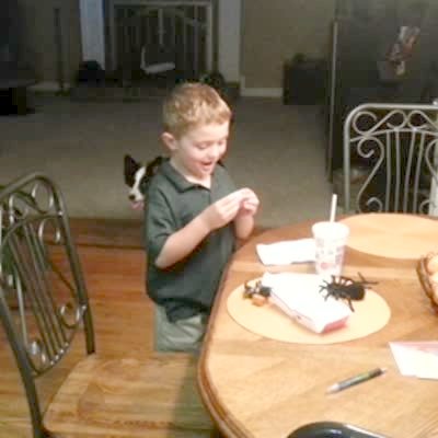 A boy screams and runs away when he sees a fake spider on the table. A woman and two dogs are visible. A man is audible.