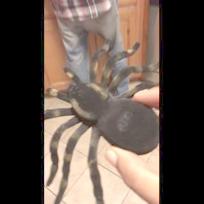 A man walks into an office where he sees a large remote controlled spider walk across the floor and he screams.