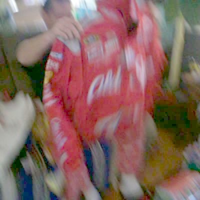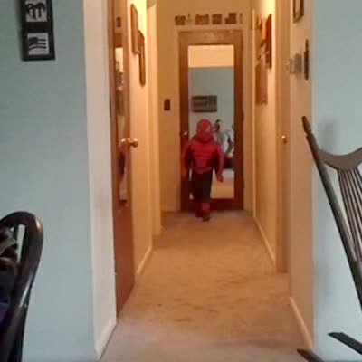 A young boy in a Spider-Man costume claims that he can see through the costume's eyes, then he runs across the living room and trips over a dog.