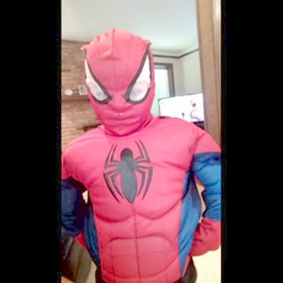 A boy in a Spider-man costume sneezes under his mask and whines from the contents getting on the inside of his mask.