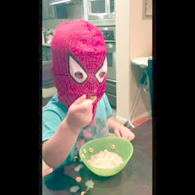 A tot boy tries to eat cereal with a spiderman mask on. He finally takes it off.