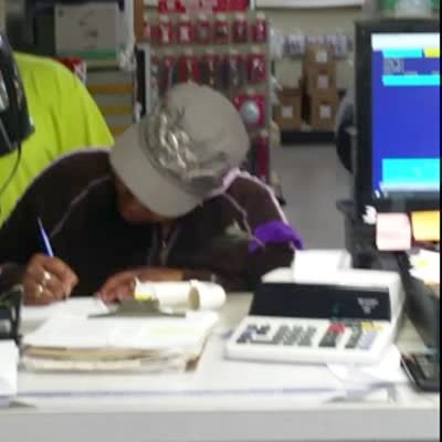 Man hides a remote controlled spider toy under receptionist's desk. She gets scared. Practical joke, office.