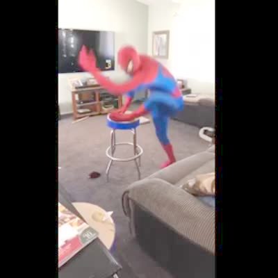 A teen boy wears a Spider-man costume and tries to jump onto a bar stool. His feet slip off and he falls.