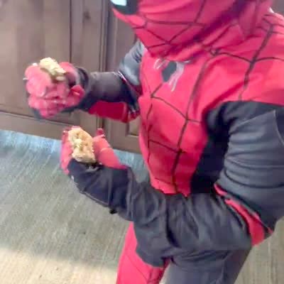 A tot boy in a Spider-Man costume tries to eat a granola bar through his mask but he cannot get it into his mouth.