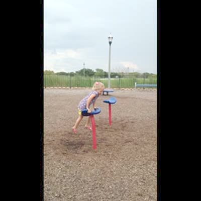 A young girl sits in a spinning chair at a park and falls out of it after spinning around.