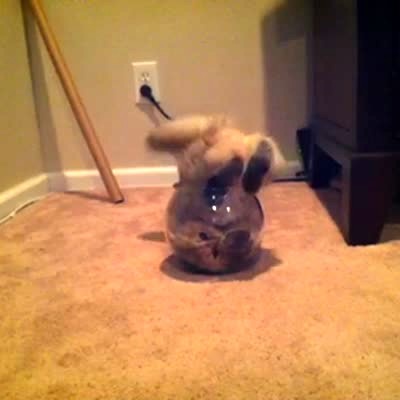 A cat dives head first into a fish bowl, spins around, and then climbs out.