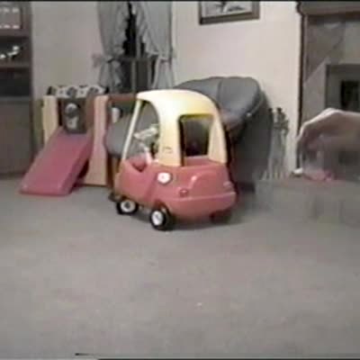 A boy rides in a Power-Wheels vehicle pulled behind a car and spins out of control and flies off the road and crashes.