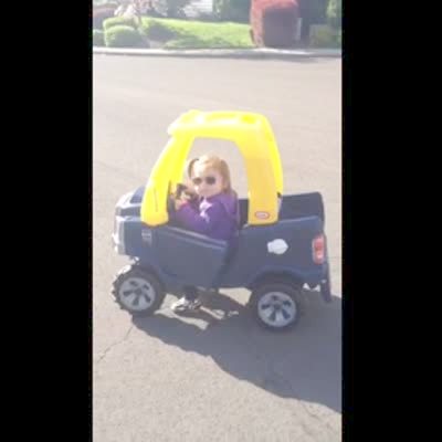 18 month old tot girl is playing in a toy car outside. Mom says turn around and she gets out of the car and spins in circles. Start at 0:25.