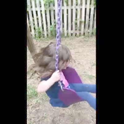 A teen girl gets scared after she starts to swing herself out over the lake to jump in and instead spins around a tree on the swing