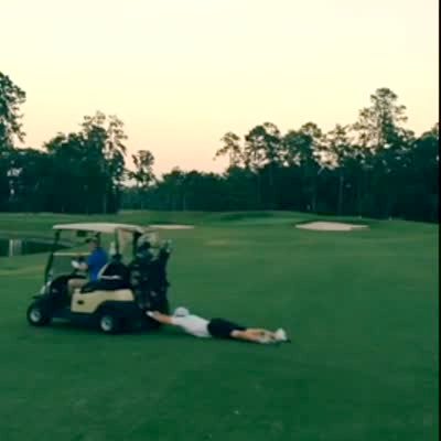 A man drives a golf cart on a golf course outdoors while another man drags behind it along the grass.