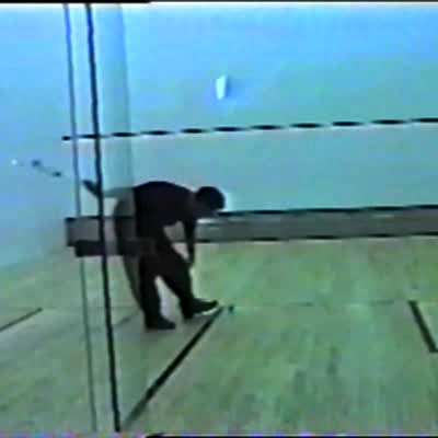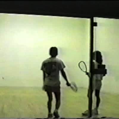 Man tries to hit a squash ball alone on a squash court. He keeps missing the ball.