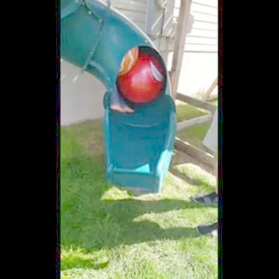 A young boy, young girl and tot girl slide down a slide in a yard but a man has blocked the slide with exercise balls and they get stuck.