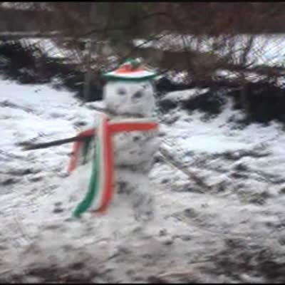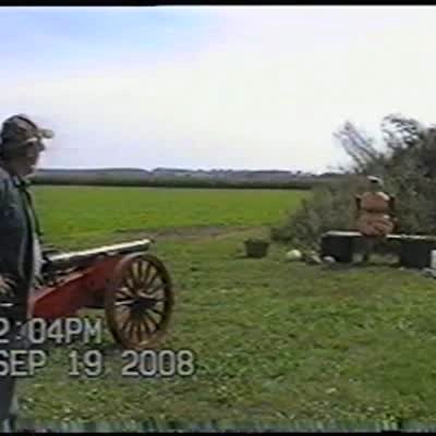 Man shoots snowman made of pumpkin, squash and cucumber with an old-timey cannon