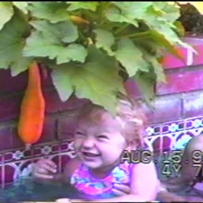 Tot girl swims in pool. Squash plant hangs nearby, mom tells girl to pick it for her dad. Girl get scared when it falls into the water.