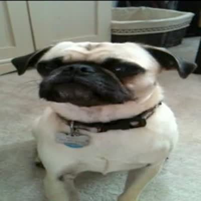 Pug dog sits on the floor licking its lips whenever a squeaky toy is squeezed.