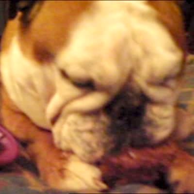 A dog moves her bottom lip at the sound of a squeaky toy.