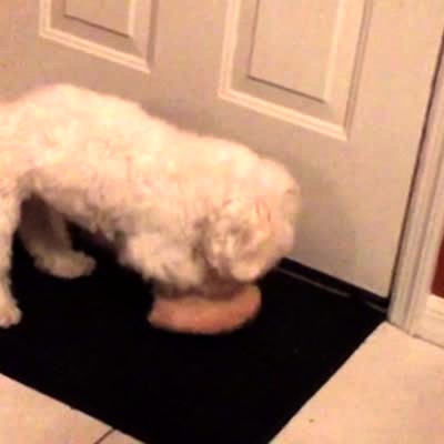 A teen girl (behind the camera) uses a squeaky toy on the opposite side of a sliding glass door to get their dog to jump and push down on the latch to unlock it, and it works.
