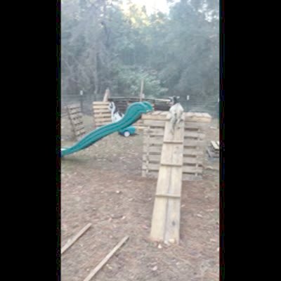 Two baby goats walk up and slide down a slide. One goat flips and falls and the other squirms around.
