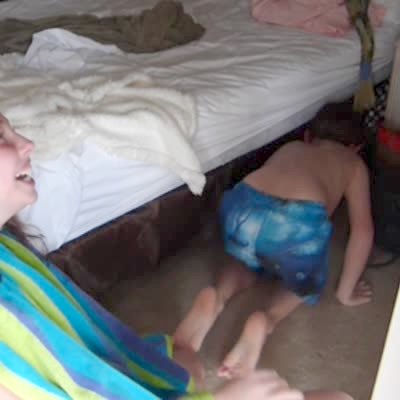 A boy and girl chase a lizard indoors and the boy thinks he's got the lizard's leg but actually pulls off the lizard's tail. He screams and throws it on the ground outdoors where it continues to wiggle and squirm on it's own.