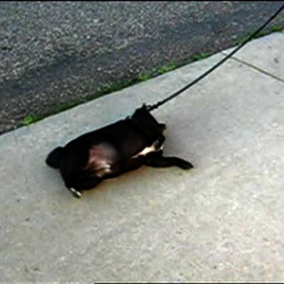 Small black dog gets dragged on a leash down the sidewalk while laying on its back. Dog doesn't want to walk.