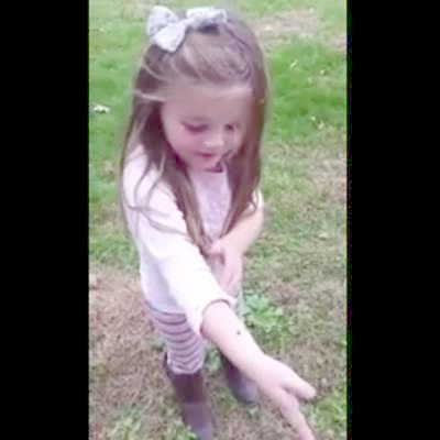 A young girl holds a bug in a yard and yells excitedly but it crawls up her arm and she screams and gets scared and a woman laughs.