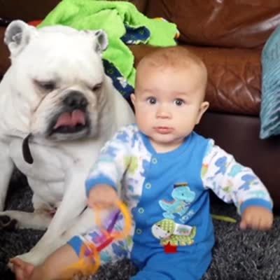 A baby boy sits on the living room floor next to a dog and the dog licks his ears and he squirms and falls over.