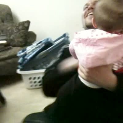 Baby girl won't let dad put her in car seat in living room so they can leave grandma's house, squirms and holds onto handle..