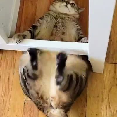 A cat has wedged himself under a low bar between table legs at home, and he lies on his back and wiggles his legs but cannot free himself.