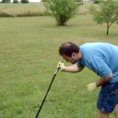 A man stabs a can of fake snow and gets hits in the face. Action at :10.