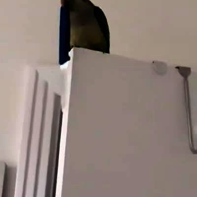 A parrot bird sits on top of a door and holds a knife at home while a woman tells him to "drop it," then the bird flies at her with the knife.
