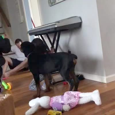 "Doggy Don't Do Stairs" A big dog puts the seat down on an electric chair and jumps in it. Then the chair takes him down the stairs. Then the chair takes him back up the stairs.