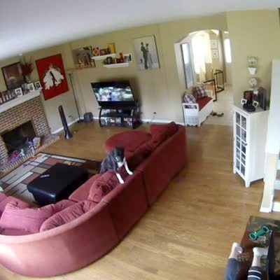 A Great Dane dog falls down the stairs in the house. Security footage.