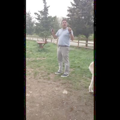 A group of dogs run at a man as he gives a speech on a field. The dogs rush and knock the man over. He falls on the ground. Short tail.