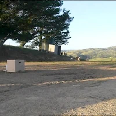 POV shot of man calling group of fifteen dogs to him in field, dogs stampeding over man. He falls down, camera goes all askew.