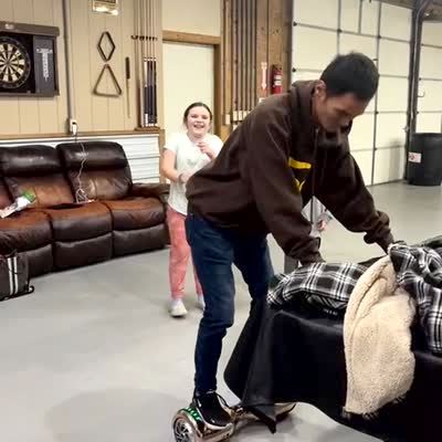 A man stands on a hoverboard and almost falls and his family off-camera tells him to get off it but he does not listen and he falls in the garage.