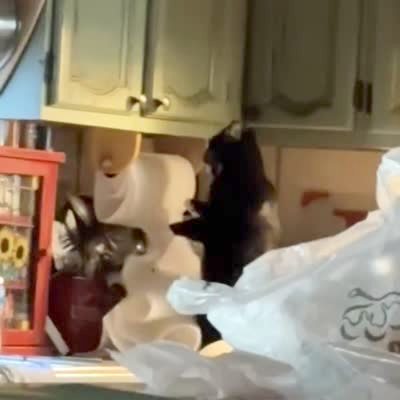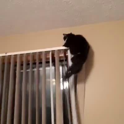 A cat stands on top of a curtain rod at home, then part of the rod breaks off, and the cat hangs from it while a woman gasps and laughs at him. He falls to the ground and walks away.