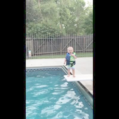 A young boy stands on a diving board at a pool and accidentally steps off the edge and falls into the water.