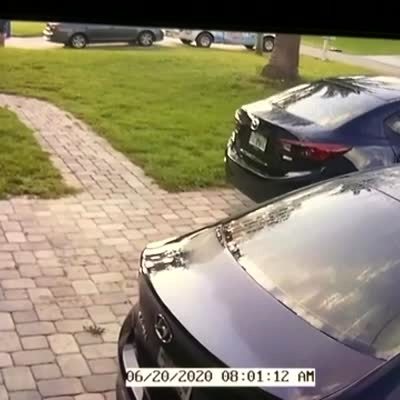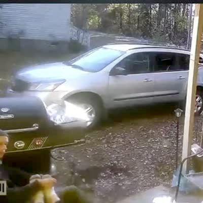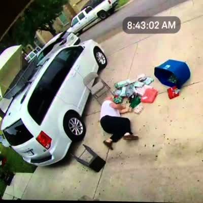 A man carries a big bucket to a car with Christmas presents in it. Then he stands on a chair and then on a stool to put them into the compartment on the roof of the car. He falls off the stool and all the presents fall. Security Camera Footage.