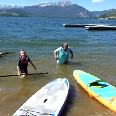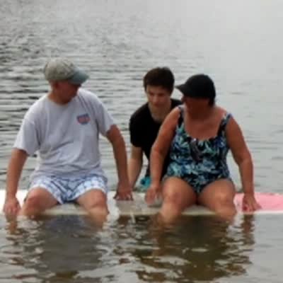 A senior man and a senior woman sit on a paddle board in a lake. When the man stands up off the board and stands in the water, the woman loses balance and falls backwards into the lake.