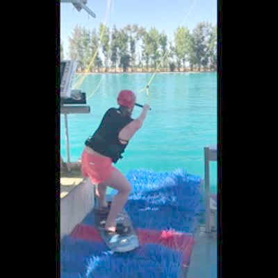 A woman stands on a surfboard then a boat takes off to pull her but the board stays behind and she flies into the water arms first. Featured talent cleared (the woman yanked into the water)