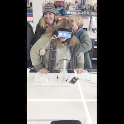 A woman uses a virtual reality demo in a store and loses her balance and falls on the floor. Her kids pull the headset off her and she she still can't stand up.