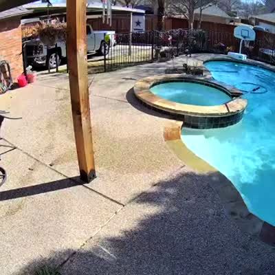 A teen girl stands on her back porch when a golden retriever pushes her from behind with its paws. As the dog runs away the girl maneuvers herself in the air so that she doesn't fall on a a metal pole. Security Footage.