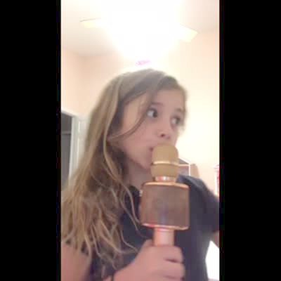 Two young girls stand on a table with a toy guitar and a microphone and they talk to the camera. One girl calls the other girl weird and she pushes her and the girl slips and falls off the table.