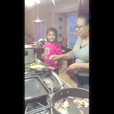 A young girl is cooking with an adult woman when she sees the camera and tries to pose, but falls off of the stool she is standing on.