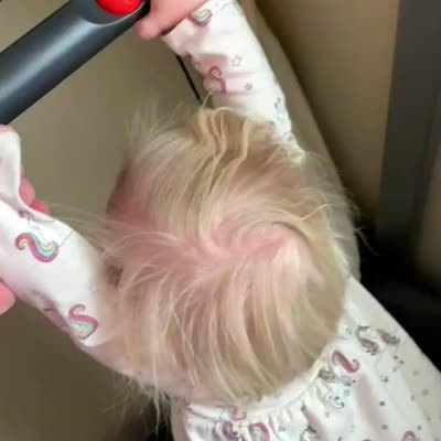 A tot girl stands on stool on treadmill to press the buttons then she pushes the go button and treadmill moves, she falls off stool but holds and hands off handles.