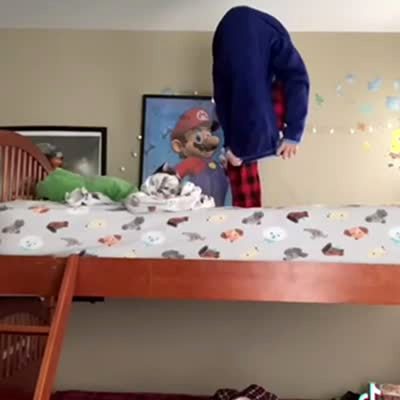While standing on the top of a bunk bed in a bedroom, a young boy puts his foot into the hood of the sweatshirt he wears. The sweatshirt pulls him forward and he falls off the bed. TikTok video.