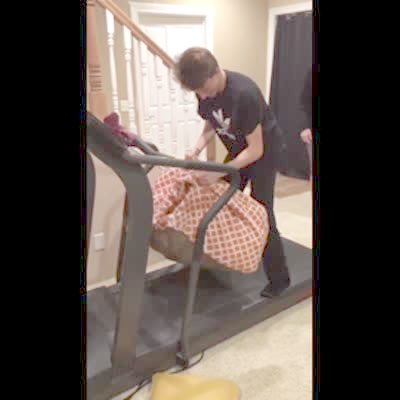 A teen girl attempts to run on a treadmill and falls off, sliding backwards.