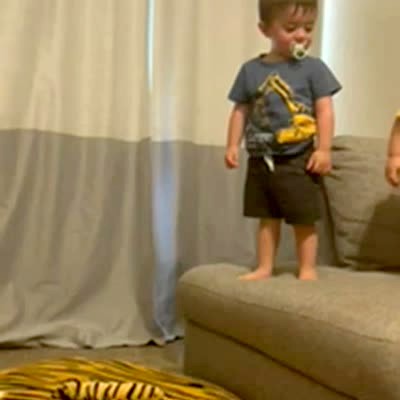 Two young boys in the living room stand on the couch and a woman tells one of them to jump. Instead, he pushes his brother off of the couch.