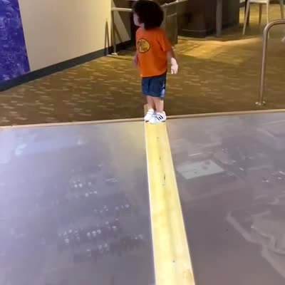 A young boy runs across a balance beam with a video projection of buildings and a river underneath. A younger boy then stands still at the edge of the beam and slowly turns to walk off of it at an exhibit. Featured talent cleared only (the two young boys crossing the beam).