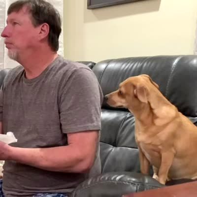 A doodle dog repeatedly looks under a man's crossed leg in a living room, because there is a plate of pizza on his lap. No audio.
